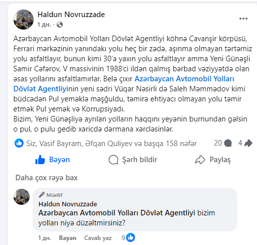 Yeni Günəşli sakini Haldun Novruzzadə Feysbuk səhifəsində belə yazıb: “Azərbaycan Avtomobil Yolları Dövlət Agentliyi köhnə Cavanşir körpüsü, Ferrari mərkəzinin yanındakı yolu – heç bir zədə, aşınma olmayan tərtəmiz yolu asfaltlayır, bunun kimi 30-a yaxın yolu da asfaltlayır, amma Yeni Günəşli, Samir Cəfərov, V massivinin 1988-ci ildən qalmış bərbad vəziyyətdə olan əsas yollarını asfaltlamırlar.